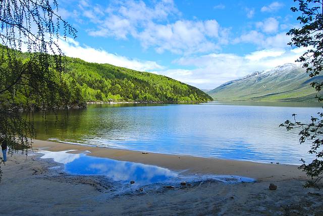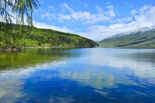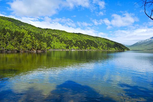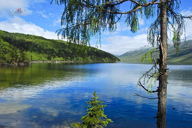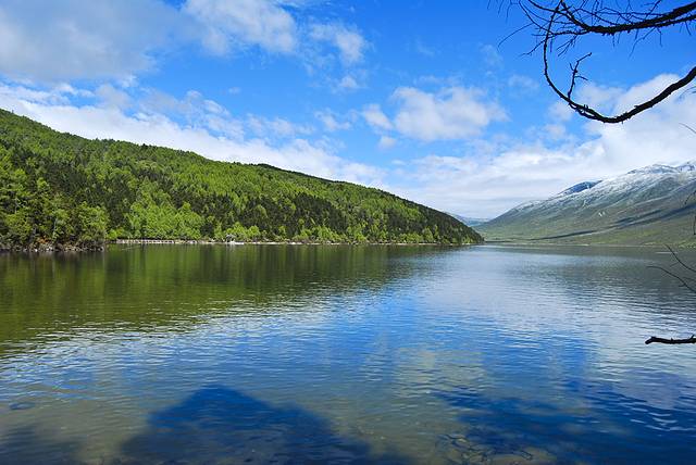 头上的蓝天白云映在湖水中格外艳丽,这正是我想要的画面!端起相机按动快门,永久留下这不可多得且不会再见的景色。