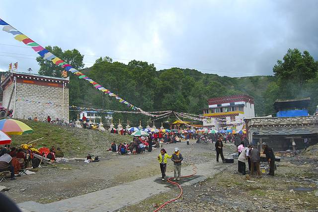 进入八美小镇时看到很多人在一个广场做活动,旁边燃烧着青棵杆,大家席地而坐,乱哄哄的看不出在做什么,我们好奇的围着院子走了一圈,想探出究竟。这时活动才开始,台子上有年长僧人在领着念经,院子里的人跟着念。仔细观察他们的表情是各异的,有的严肃认真,有的喜皮笑脸。