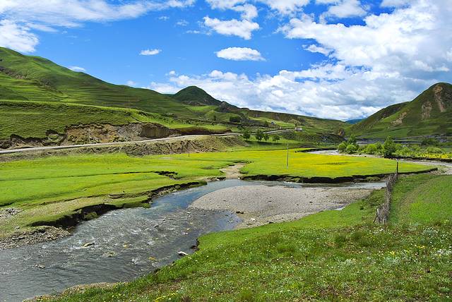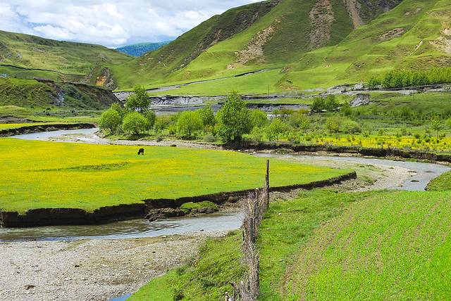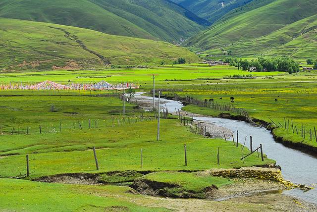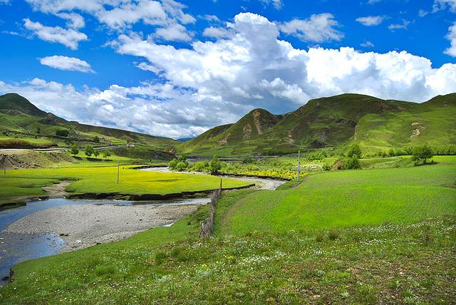 新都桥有着神奇的光线,小溪清澈蜿蜒,山峦连绵起伏,藏寨散落其间,牛羊安详吃草……川西的平原风光美丽绽放。令人神往的“光影世界”、“摄影家的天堂”。