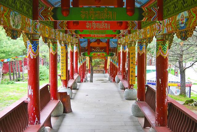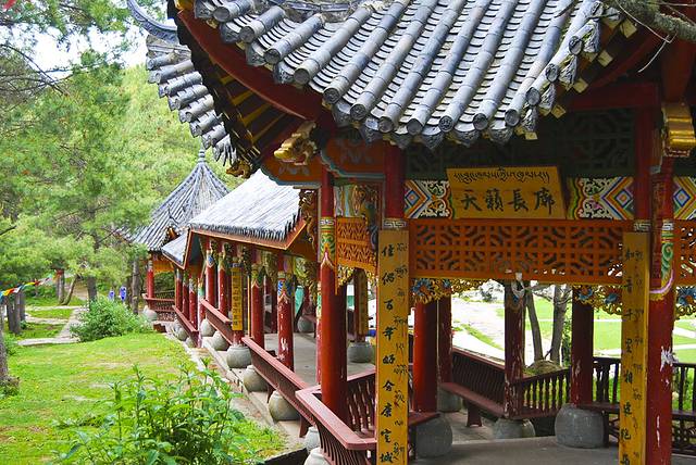 快到八美时,路边的惠远寺映入眼帘,走近看,大门在修,门两边各一排白塔,进去后是个大院子,里面还套着一个院子。我们试探着走进去。四周是僧人住宿的房屋,中间一座大殿,草地上坐着几位学习的僧人,仔细看全是年青人,其中还有两个十几岁的孩童。这时过来一位僧人招呼我们,并叫来另一位僧人带我们参观大殿,从侧门进去后,看见里面一排排铺着藏毯的念经台,中间几排台子上坐着正在念经的僧人,屋顶悬挂着五彩经番,这情景我在电视里介绍的布达拉宫时见过,如今亲眼所见还是头一次。僧人非常友好地领我们参观了一圈儿,不断地讲解惠远寺由来,告诉我们这是在雍政年建的寺庙。寺里还有不少藏品,其中的大型酥油花非常漂亮。