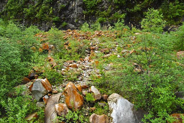因昨天买了下午2:00去雅安的车票,所以7:30出发,雨是停了,但天很阴。出了康定新城,过了老榆林就是一条山路,应该说是条废弃的路,无政府车辆,所以无人保养,路上全是落石,越往上走雾越大,快到山顶时有一处山体滑坡堵住了路,一定是昨晚的雨有些大造成的滑坡。