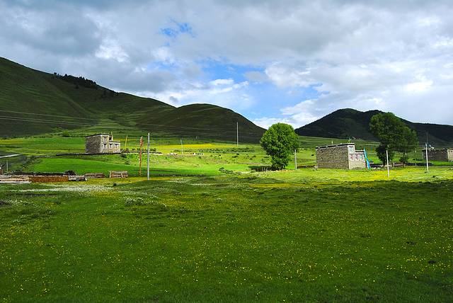 出了新都桥开往康定的5公里一段的确景色不错,左右两边都是起伏的山恋,下面是清澈弯延的小溪、牧场和挺拔的白杨,零星的藏式民居点缀期间,极具风情,如果加上光影定会魅力无限。