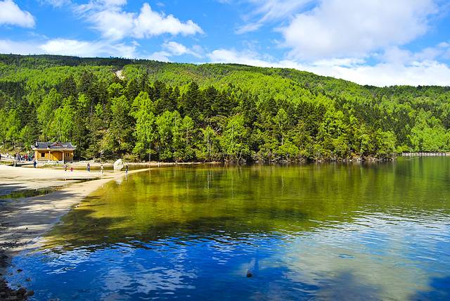 木格错是山顶上的一个大湖,远处是雪山,周围是树林,还有一片金色的沙滩,修了个栈道可绕湖一段。也有游船70,可到湖对面的红海草原,还可沿湖边的小路向上走一段,到达山坡上面的白海草原,可见一大片草甸,风景好极!