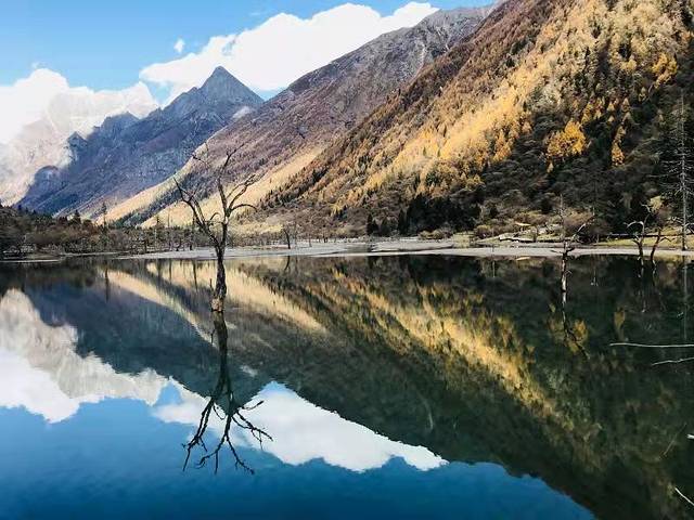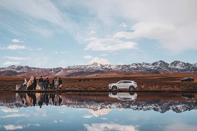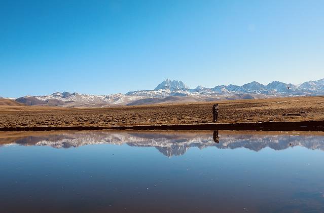 塔公往夏马龙村路上拐弯处有一个小湖泊可以观看雅拉雪山倒影。