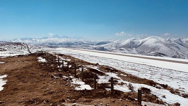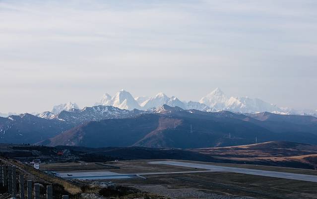 下雅拉垭口首先来到康定机场道路,在这里除了看贡嘎雪山,也能看到高原机场飞机起降,看飞机飞越贡嘎山系,航班有限,全靠运气。