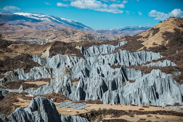 “春赏格桑夏避暑,秋观彩林冬踏雪",川西高原的四季都风景如画,绵延在鲜水河断裂带上的墨石天然景观则显示出大自然的鬼斧神工。来到这里,眼前连绵不断的墨石,丘壑纵横,山峰峭立,登高远望,蓝天白云之下,群山绵延,河流蜿蜒,高原风光尽收眼底。