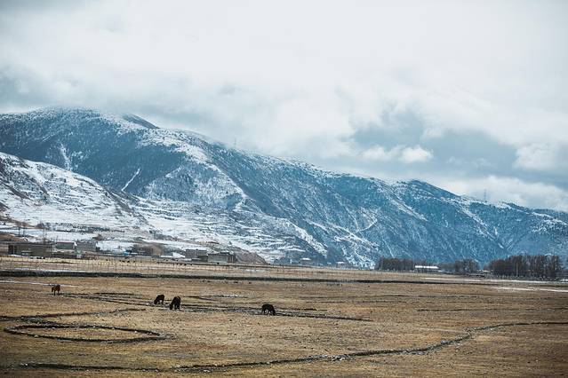 今天继续前行,来到寂寥的冬季草原,天似苍穹,笼盖四野,雪山就在眼前,只身在草原中会有强烈的孤独感和渺茫。