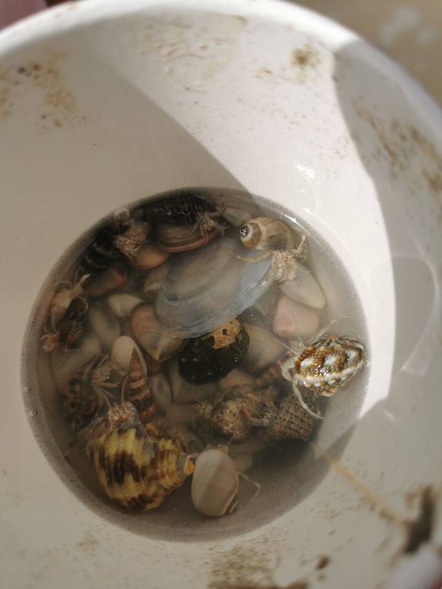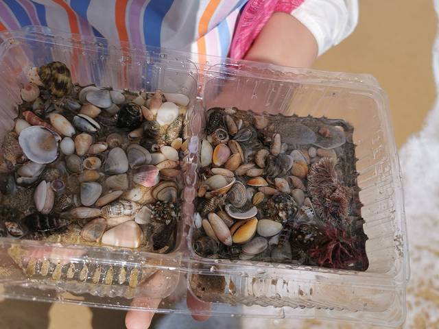 这里啊 有很多小贝壳和寄居蟹。诀窍就是要—眼疾手快