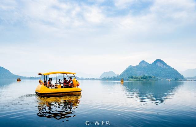 天鹅湖游船项目非常特别,游览者可以自己充当船长开着漂亮的船儿在1680亩水宽云阔的天鹅湖上游荡,或远或近的喀斯特峰林、建筑、游船倒映在清澈的湖面上,让人真真切切地感受什么叫“人在画中游”。