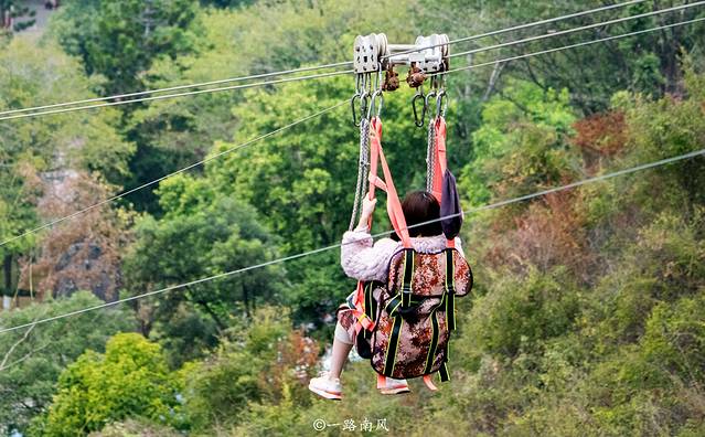 丛林飞车的出发“车站”位于天山山顶,终点在山下,线路全长999米,是世界最长的悬空丛林飞车,途中有2个16米高空大回旋, 坡度达到85°。整个旅程穿行于森林与喀斯特地貌之间,不停的拐弯、下冲引起阵阵尖叫声,真是刺激又带感。