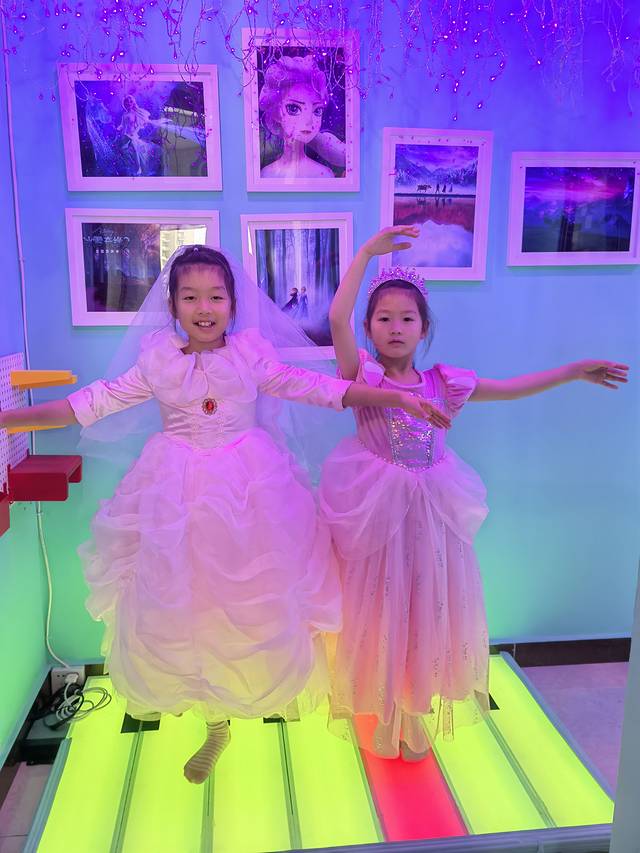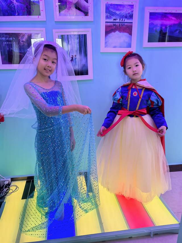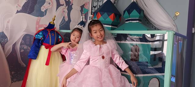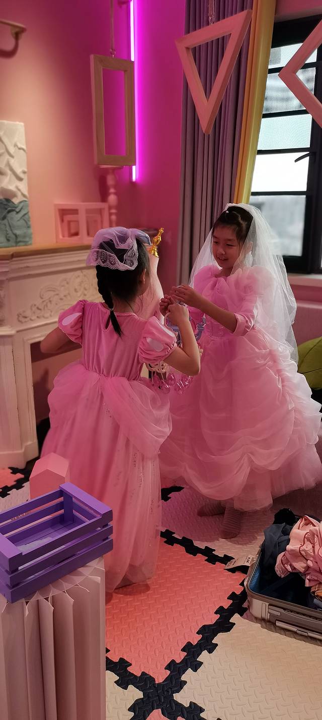 虽然昨晚2点多才睡,第二天早上10点不到孩子们就睡醒了,房间有很多公主服装,和孩子们一起玩变装游戏,衣服好像量身定做的,非常合身,帮她们拍了好多照片
