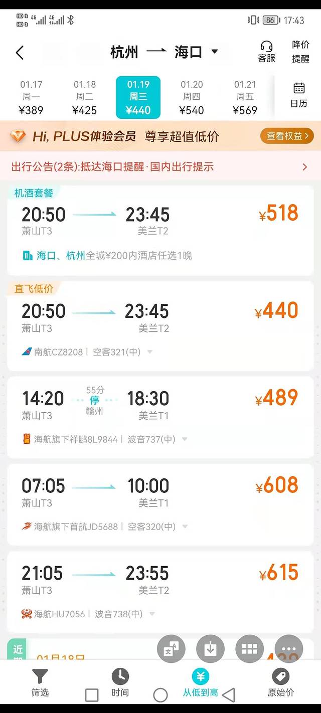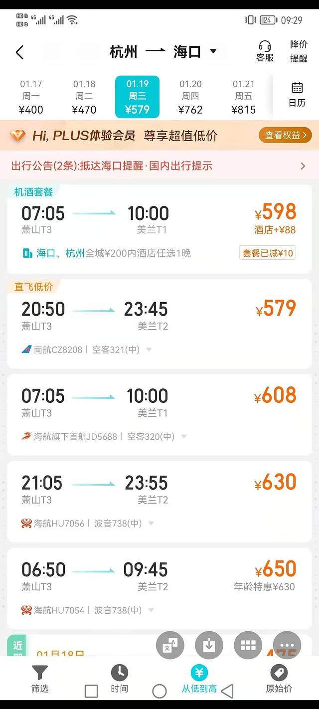 如我所料,机票降到400多,在没有新冠疫情前,这个价格是不能想象的,寒假一定是海南旅游的旺季