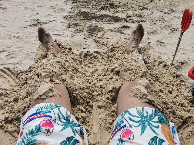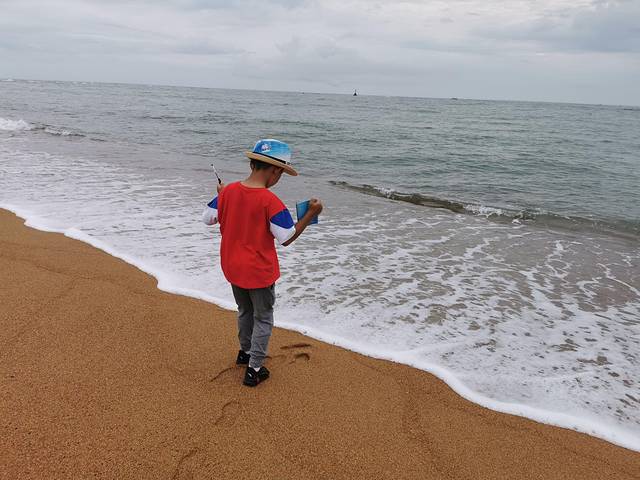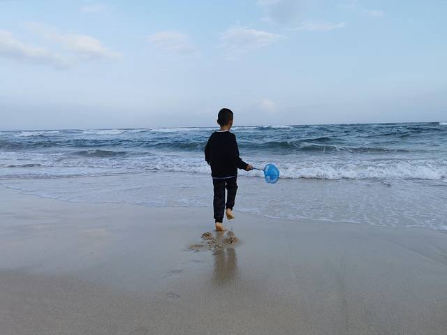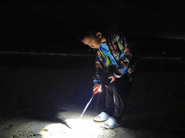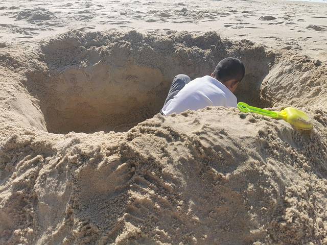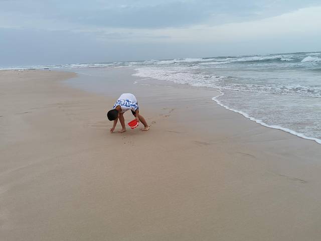 返回停车场,往另外一边走,仍然是沙滩。拿出装备,抓螃蟹。