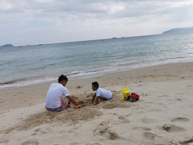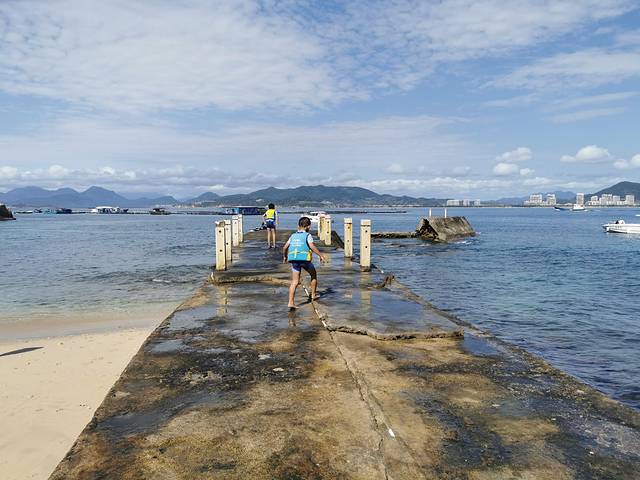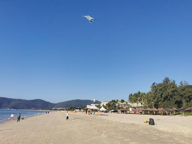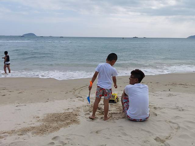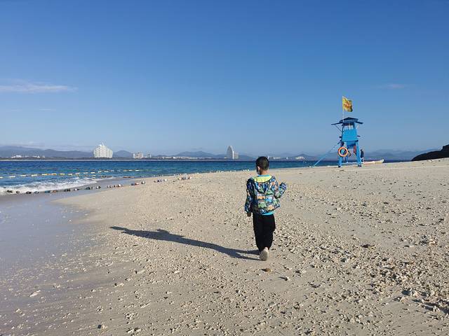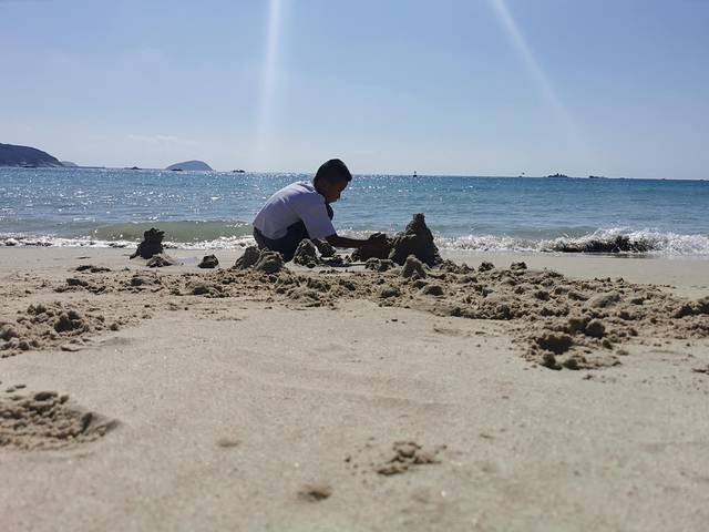 导航蜈支洲岛停车场,36分钟到达。这里是后海村,停车场进去,有繁华的商业街。我们去海边,什么都没找到。海棠湾的沙质仅次于亚龙湾,细软,且白。浅水的区域长,街道两边的夜晚也热闹,有很多小吃,也有酒吧,我们坐在沙滩边静静的听了好几首弹唱。