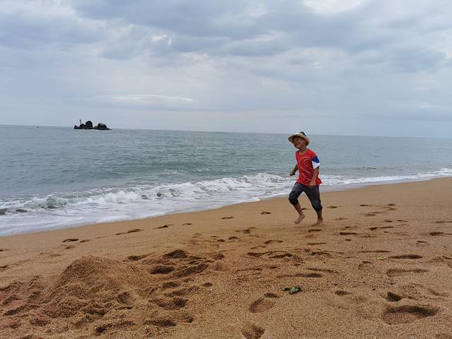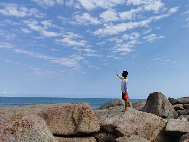 12点多出发,目的地大花角。一路上,好多个可以下到海边的路口,我们在万宁的瞭望台位置下到海边。