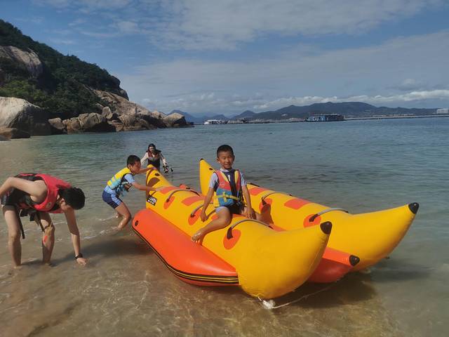 孩子们坐香蕉船到沙滩,我和另外一个老乡从船上游到岸边,一边游,一边可以看水下的珊瑚,海胆和小鱼们。