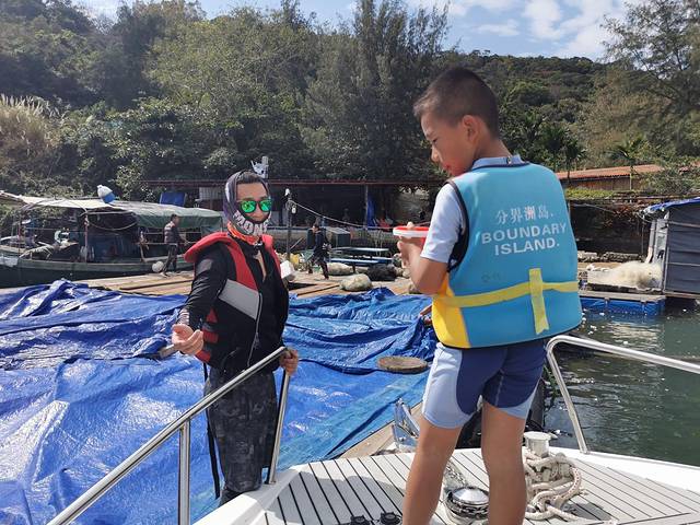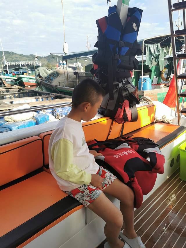 先和可恩浮潜了一会儿,上午海水还是有点冷的,不一会儿他就冻的上船了。