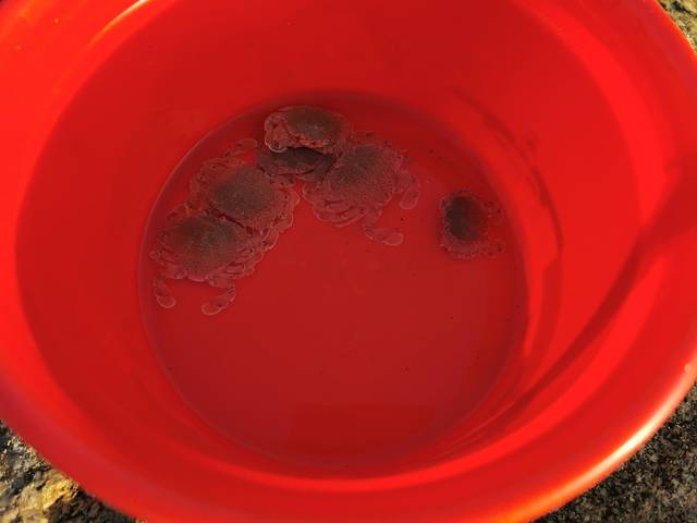 这次请教了别人,知道怎么用诱饵来抓螃蟹了,只是我们带的网太小,装备不给力,最后只抓了6个。可恩要带走,这次不放生了。