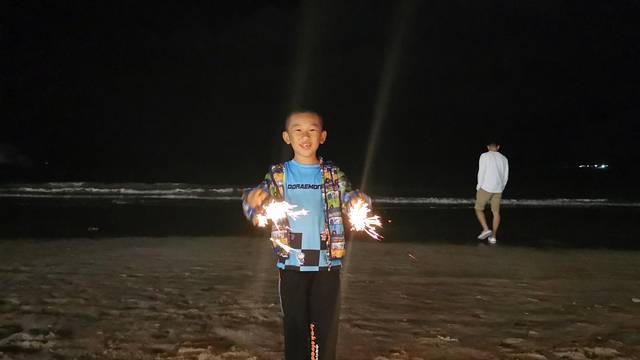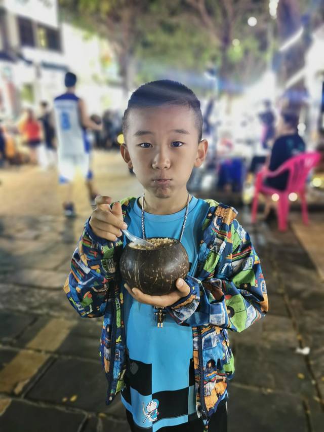 晚上六点四十,天黑了,在沙滩边的档口吃了晚饭。中午没好好吃饭,所以晚上可恩吃了好多。原计划点个文昌鸡,都是按只卖的,怕吃不完,就点了其他的菜。