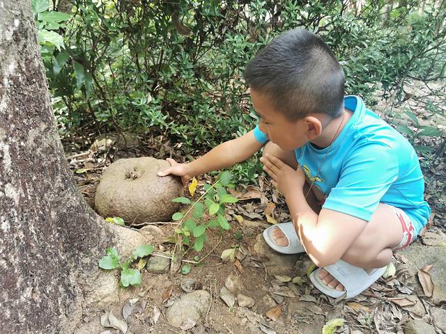 见血封喉树,可恩念念叨叨的,终于见到了。树干上贴着禁止触摸。这种树多产于海南和云南两省,汁液是古时打猎抹在剑尖上的毒药,树皮被黎族等少数民族用来制作衣服。