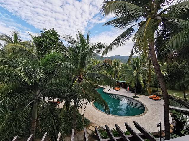 房间下面看到的另一个泳池,旁边有结了很多椰子的椰子树。