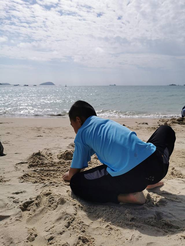 因为沙子粗,沙滩上可以踩出深深的脚印