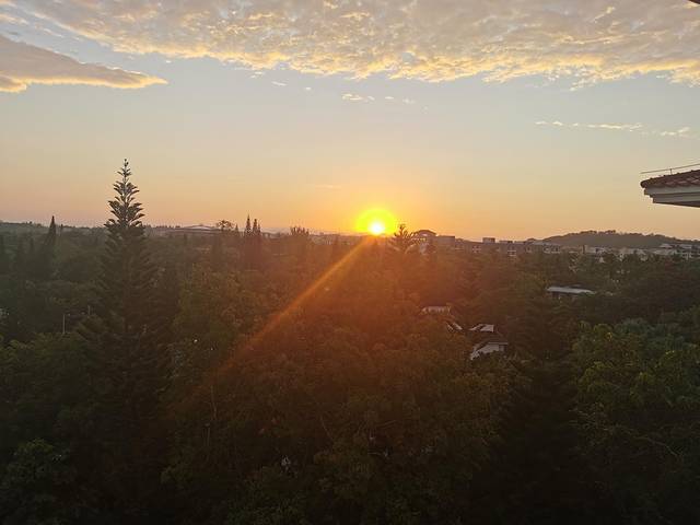 阳台里看到的日出,今天是阴天,太阳从云层里偷偷发出来的万丈金光。
