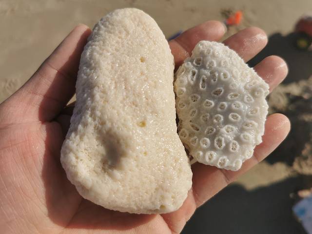 第一波到达后,还没什么人,观光车还没开始,我们到对面的沙滩边,有很多珊瑚石,蜈支洲岛大部分沙滩因较多的珊瑚石而不适合光脚走路。