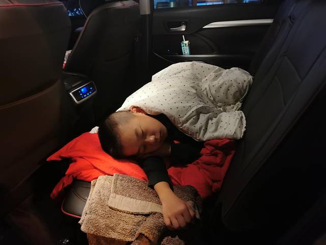 已经在车里睡着的可恩,自带了最喜欢的小白被。