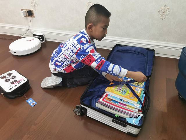 自己整理了出行物品。皮箱里除了生活用品,还带了23本书,两袋笔,两个本子,一个削笔刀,珠心算作业。