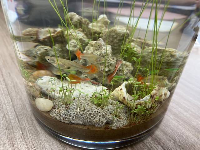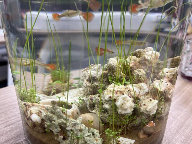 捡回来的石头贝壳,拼拼凑凑,填充了一个小鱼缸。没有带沙滩的沙子回来,用了沙漠的沙子,颜色偏深暗。
