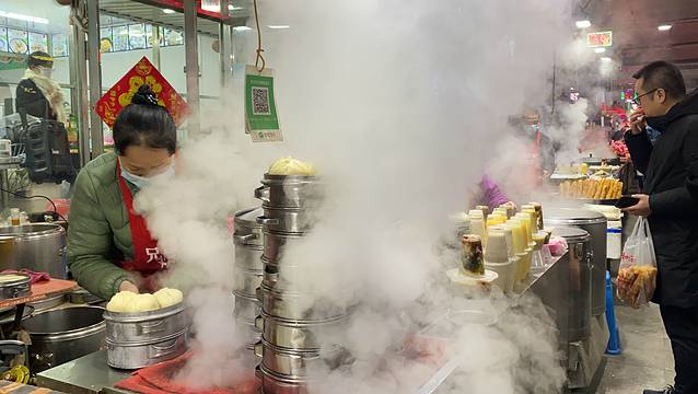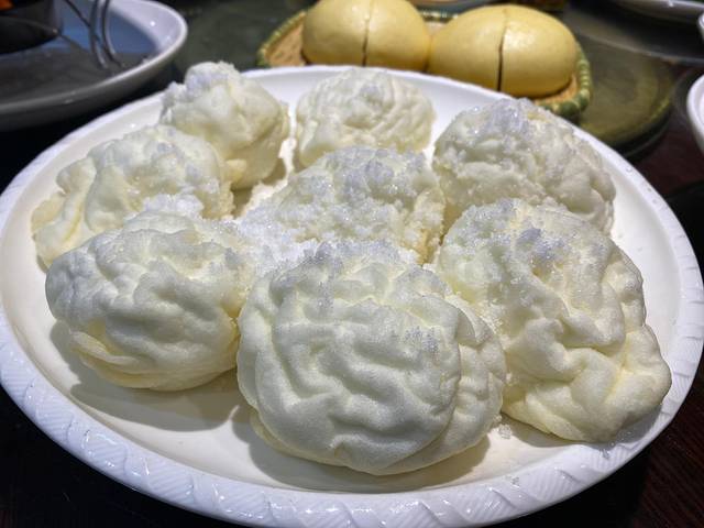 忘了叫什么包子,反正好好吃!皮是鸡蛋清做的,里面是红豆沙馅,表面一层沙塘。吃剩的我打包带走了,哈哈!