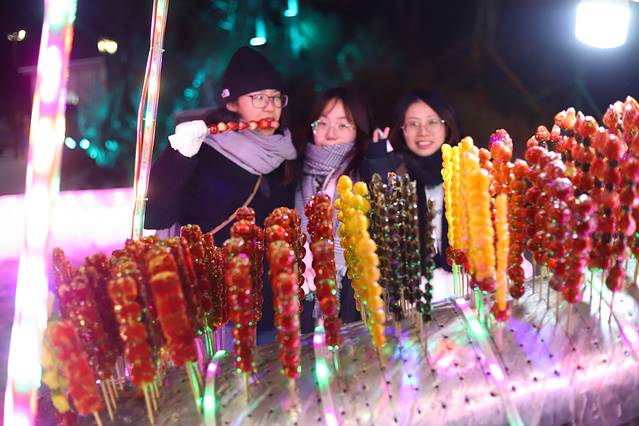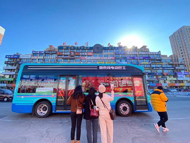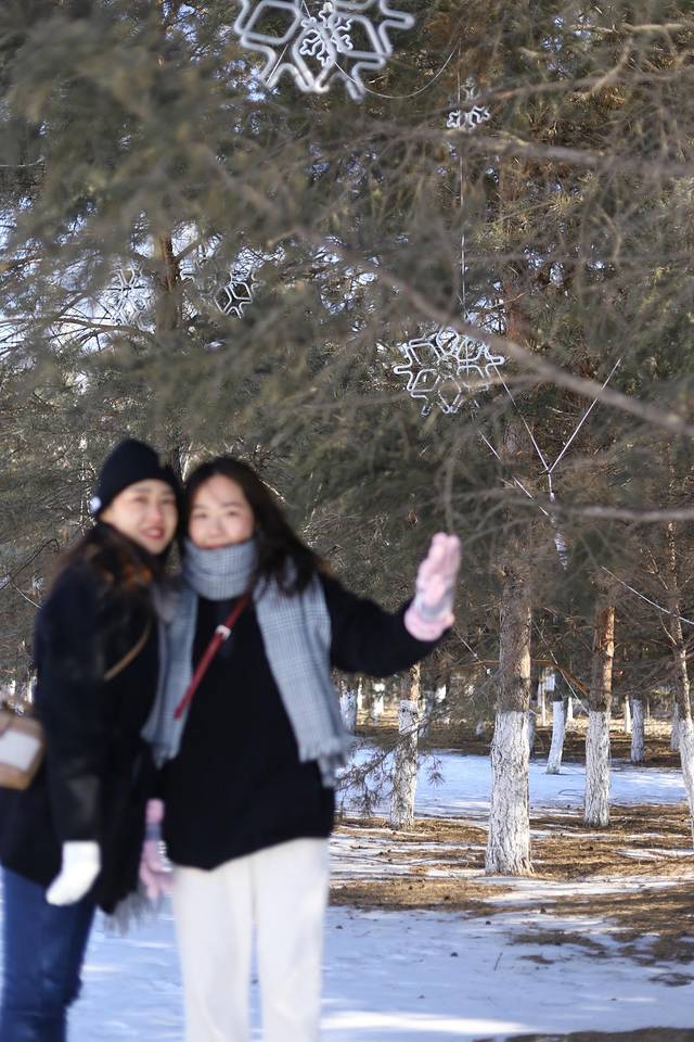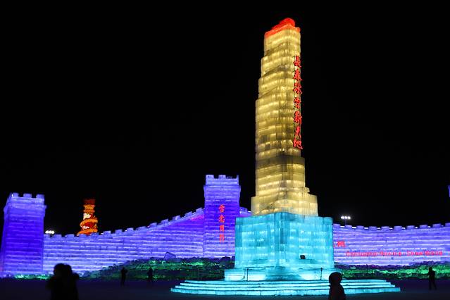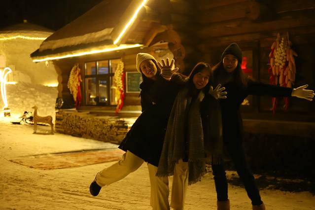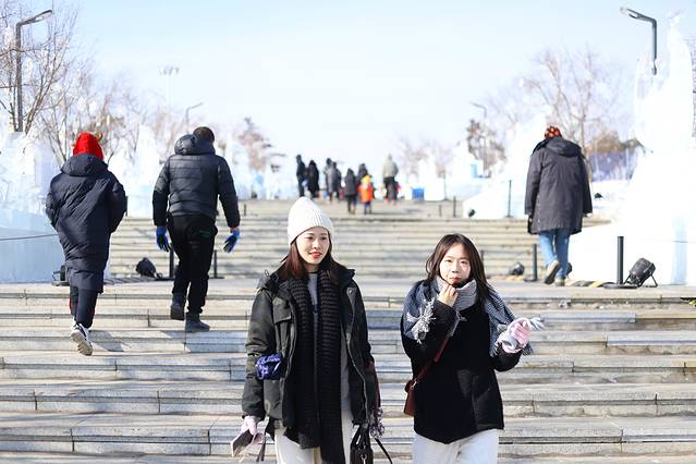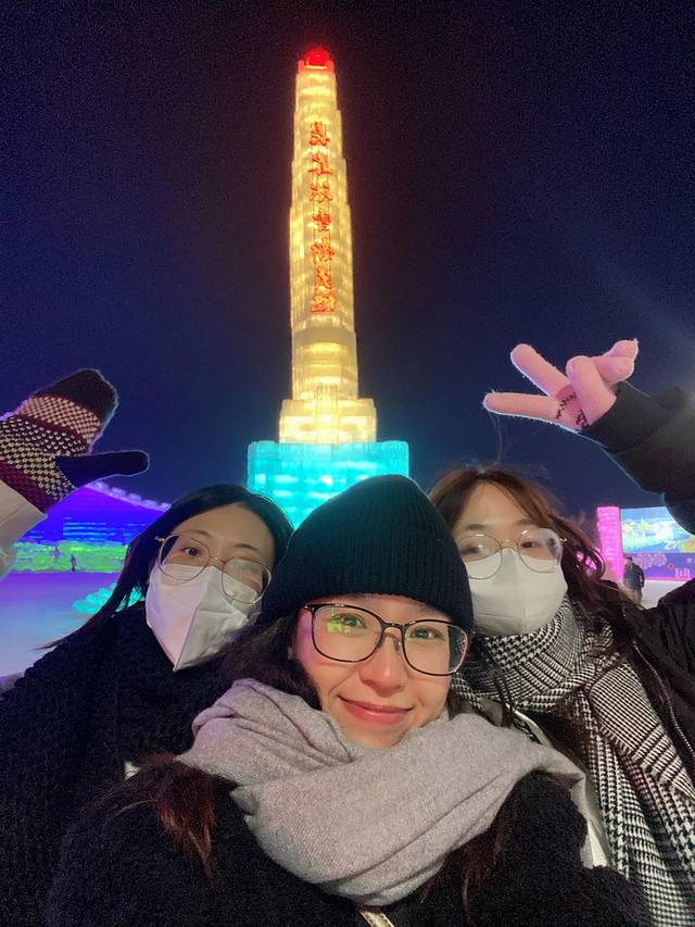 吃完饭是下午4点左右,已经开始天黑了。我们赶车去冰雪新天地,因为我想白天看里面的冰雕,白天拍照好看,晚上的灯光五彩斑斓,我们三姐们都觉得有点low,而且门票需要180元。最后我们只是在外面溜达了一下,屁股蹲了几次,拍照打卡,到此一游。