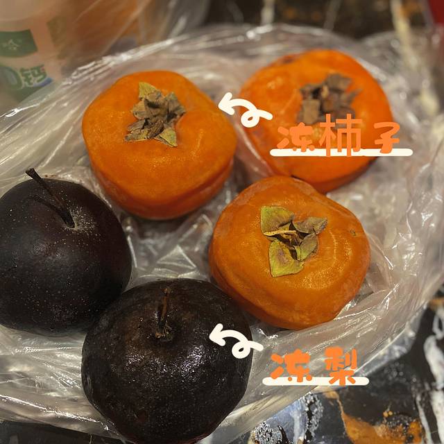 东北特色,冻梨和冻柿子,好好食好好食,我真的好喜欢,这个冻梨的水分多得让你不敢相信。去东北旅行的你,一定要试试。推荐!