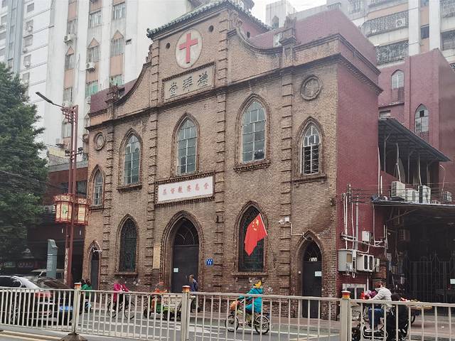 穿过这条古巷来到莲花路,马路对面有一片绿地正是莲花广场,公园是附近居民聚会的地方。在莲花路旁,矗立着一座教堂建筑,由红砖砌成,因为距离马路太近,需要到马路对面才能看清全貌。大门上方写着“基督教赉恩堂”,红十字架下面还有“礼拜堂”三字。整个教堂呈对称设计,是哥特式教堂风格,但屋顶覆盖着中式的绿瓦,中西合璧显得非常特别。