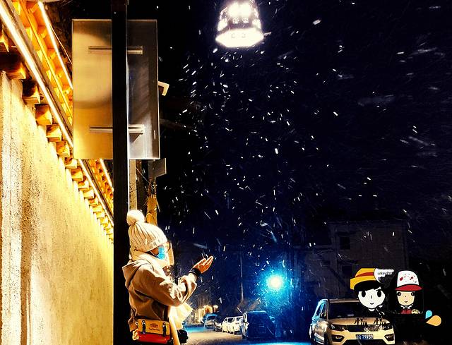 晚上在路上走着走着,天空忽然下起了雪。路灯的照射下,雪下得更旺了。