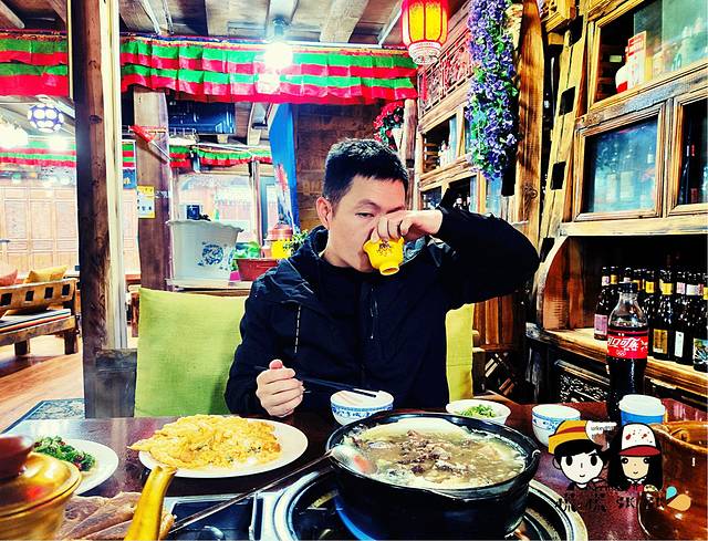来这边吃火锅一般就是松茸土鸡,野生菌腊排骨,野生菌土鸡,高原牦牛肉,黑山羊或者是云南米线。常见特色蔬菜就是一些野菜、红心土豆、水性杨花等,鸡豆凉粉不是很吃得来,小酒酿还是挺有感觉的。边吃饭,边喝小酒,听民谣。