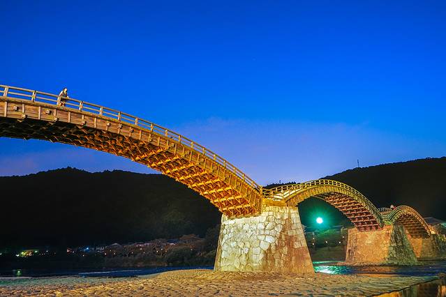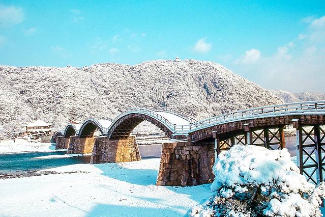 锦带桥是日本代表性的木造桥。构造精巧、独特。5个拱门很美,春天是樱花,夏天为烟花,秋天有红叶,冬天会下雪,从拱门可以看到四季不同的景色。