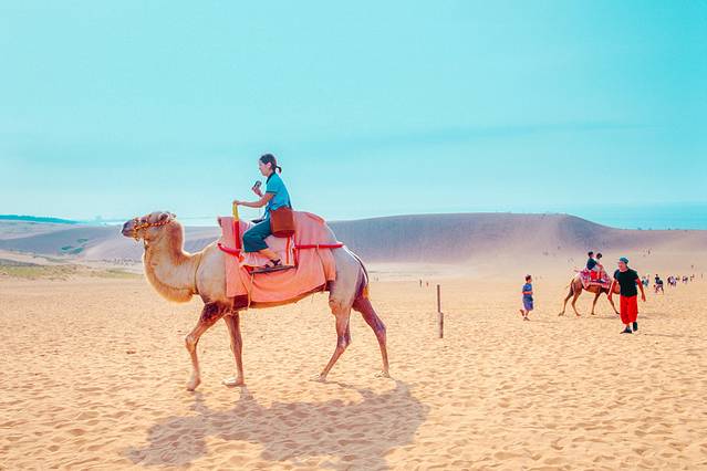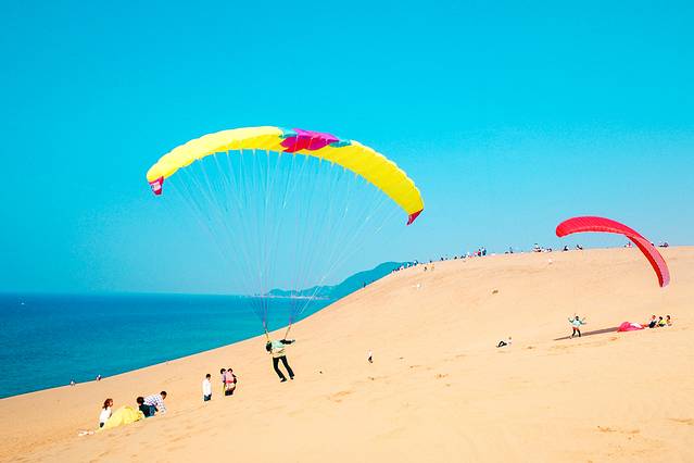 鸟取山丘最大的看点便是沙丘与海相连,从沙丘看到的海景美艳超绝。这沙丘与海的交织,这里的沙丘不仅能靠眼睛观赏,更能在沙丘中纵情体验。骑骆驼漫游、挑战沙漠自行车、体验滑翔翼、尝试下滑沙……这里众多的项目,玩上一整天都不会厌倦。