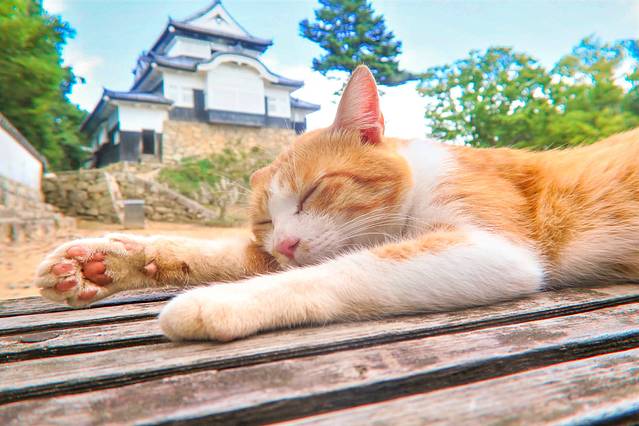 在山城中,还有额外之喜。就像咱们故宫有带刀御猫,这里的城主也是只喵,名号三十郎。三十郎经常慵懒的躺在这里,静候着全世界猫奴和铲屎官们登门瞻仰。它可爱的样子可以消除登城的疲惫,因此备受游人欢迎。