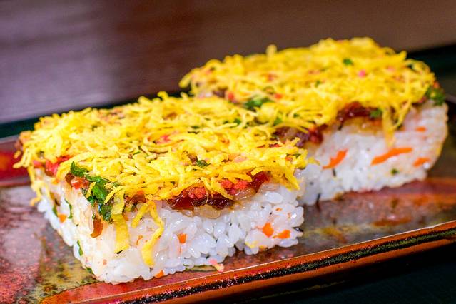制作岩国寿司时会将醋饭和食材交替叠加,其高雅的味道和华丽的外观绝对会让人大为满足。