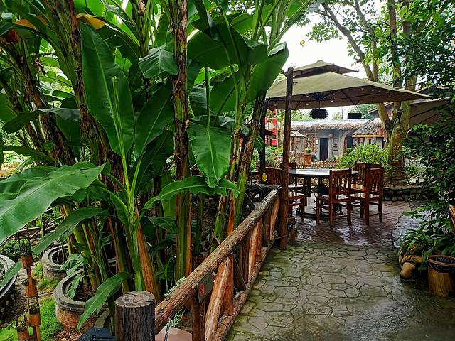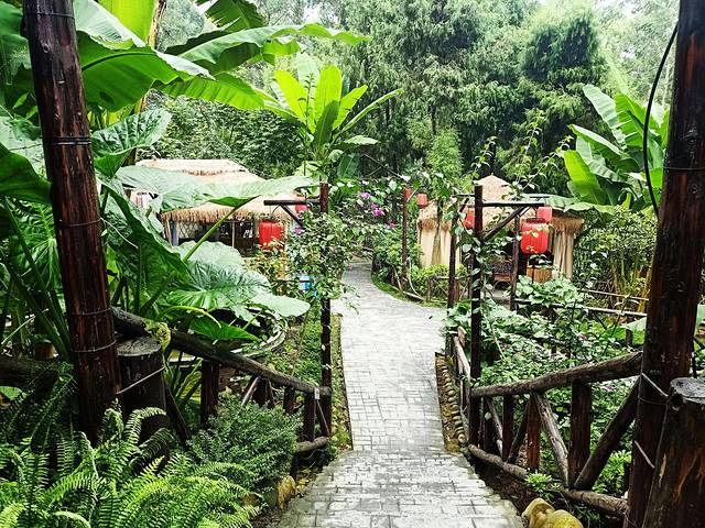 院子采用的原始田园风格,用篱笆围成一个个独立的帐篷式包间,造景,朴素而静雅,帘子之间,置一品茶台,若是在风和日丽的午后,沏一壶清茶,慢慢细品它的醇香甘甜,静观着山中美色,怡然自得。