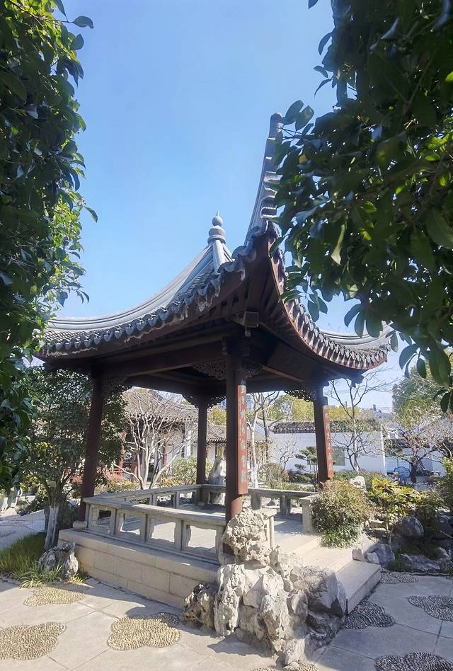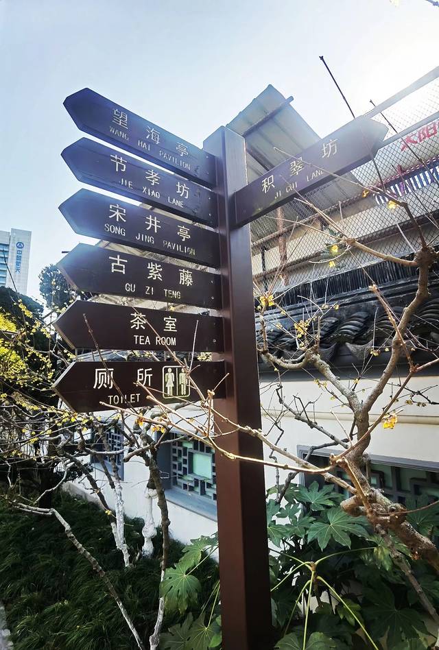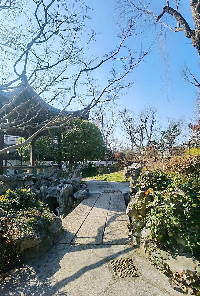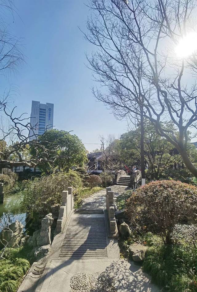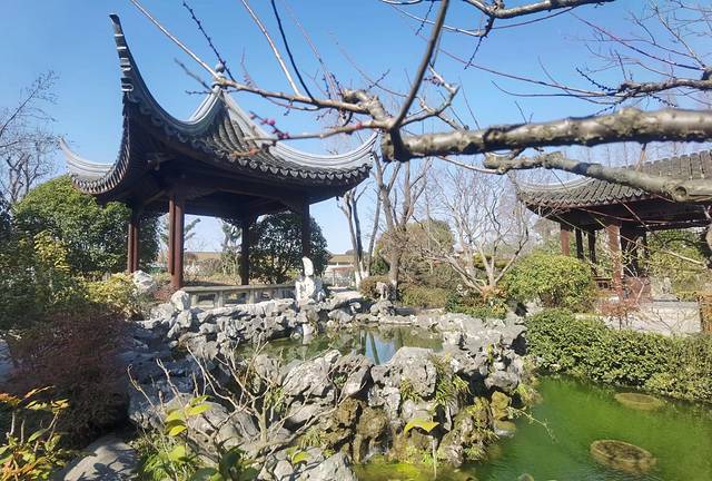 当你走进园内,你会发现平面的布局、空间的组织、意境的创造,产生了引人入胜的效果, 一山、一池、一楼阁、一亭、一榭、一复廊、一桥一石一景墙,各自成景,走遍园子,感觉园内的两处地方比较出彩:一处是景墙+半亭。它位于园内的西北端,在一道景墙前,设置了一座亭亭玉立的翘檐形半亭,亭中置放着“八棱石井栏”,该景取名为“宋井亭”;还有一处是池塘+复廊。它位于园内的池塘南面,两个廊中间隔了一道墙,均可通往同一个目的地,而景致却是截然不同,这种故意分隔不同景色的建筑手法,实在是巧妙。