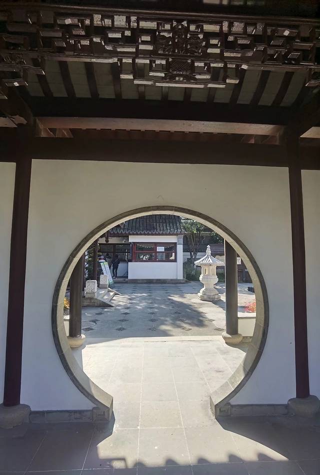 中国园林的园墙常设洞门,常见的有:月亮门、葫芦门、八角门、贝叶门、如意门、月牙门、蕉叶门、海棠门等,“古藤园”中的洞门也是别有洞天,挺有特色,一个洞门,一种风情,我觉得这些洞门就是一幅天然的画框,洞门里的景色就是一幅美妙的画作,园内还有洞门套洞门的设计,给人一种幽深莫测的感觉,形成了园中有园、景中有景、步移景异的观赏效果。真可谓:洞门无门有天地,天地有别在洞门。
