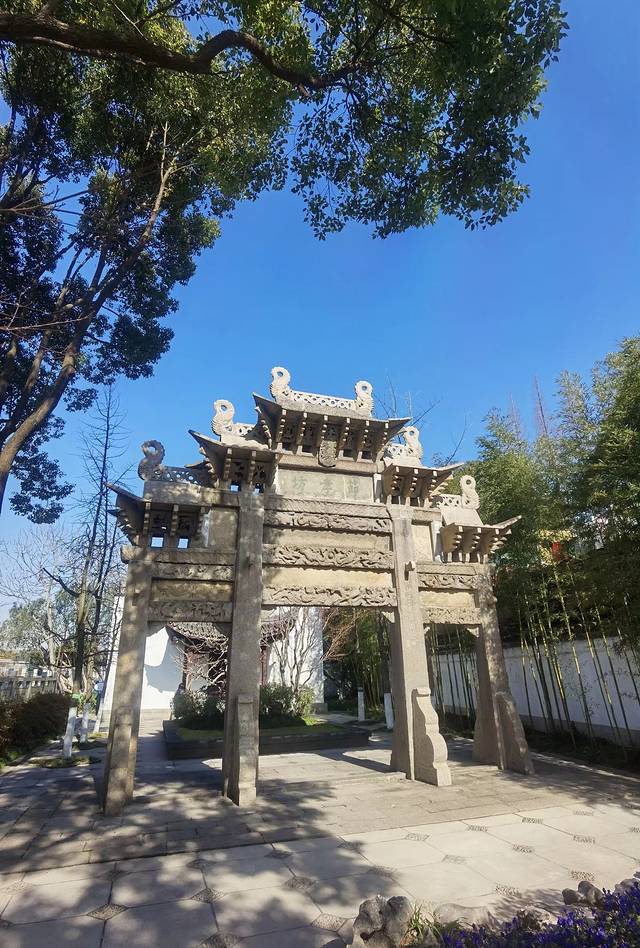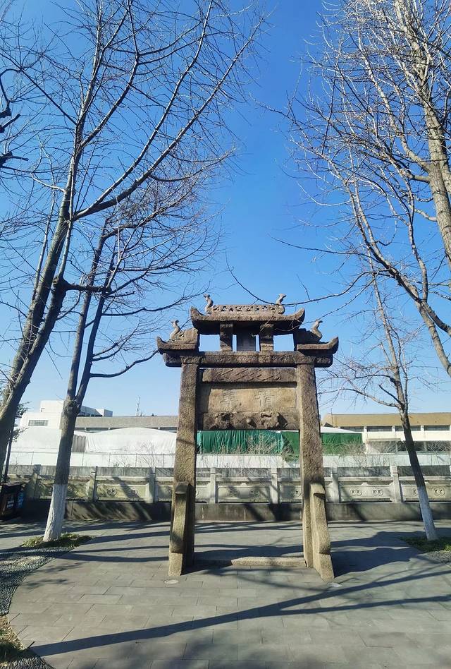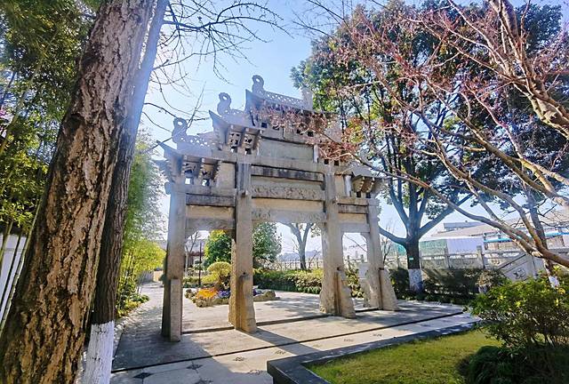 2、清代“节孝坊”。这是一座三门四柱五顶式花岗岩石雕牌坊,始建于清乾隆十二年,牌坊高8.00米,宽7.23米,中间顶檐下为蟠龙纹的青石立碑,正面刻有“聖旨”二字,背面好像有字又好像没字,看不清楚了,其下横匾镌有“节孝坊”三字,门上横枋前后都雕有飞禽走兽、云龙鱼蚌和吉祥纹样等高浮雕,四根立柱前后均雕刻楹联;牌坊原址在闵行老街前东街15号的旅馆内,就是现在的浦江花苑东南面,上世纪90年代闵行老街改造拆房,把它迁移到了园内,现为区级文物保护单位。