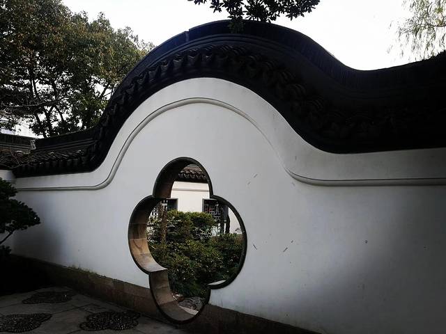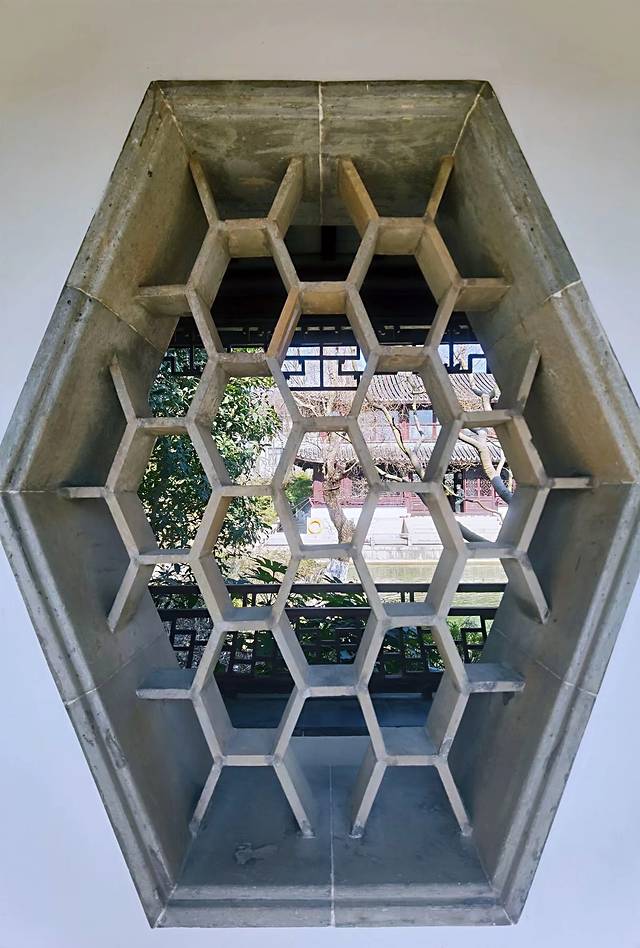 一座园林,就像一幅画,如果没有漏窗,总觉得精、气、神缺少了点什么,站在园内的漏窗前,漏窗内的绿草碧树、花坛石峰、通幽曲径虚虚实实、影影约约,渲染了一种扑朔迷离的神秘,不由得生出了迫切的心情,想探寻其中的奥妙;园内东面的院墙,有两扇漏窗套漏窗的设计,很是巧妙,每扇漏窗内的景色各自不同,画中有景,景中有韵,让整座园林一下子就有了妙趣,透过漏窗,好像窥见了整座园林的灵魂一样,李渔所说的“尺幅窗,无心画”的境界,通过这一扇扇虚空的漏窗,给人们带来了一种深远无尽的想象。