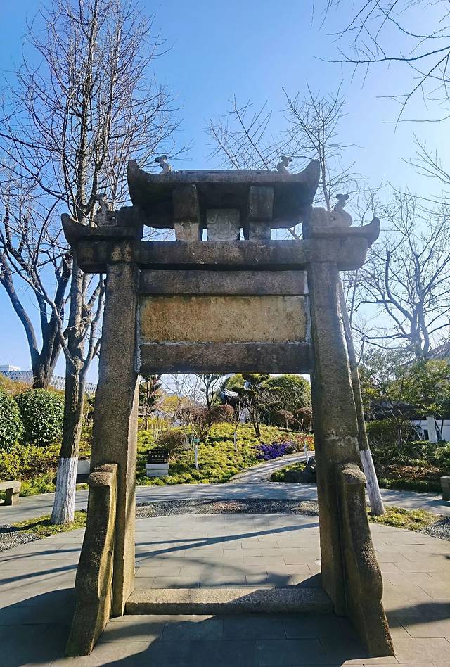4、民国“崇德桥”。这是一座三节四拼花岗石平板桥,长8.35米,宽1.45米,始建于民国4年,原址在马桥镇工农村杨家宅西里溪泾上,上世纪90年代建园时,拆迁部分构件安置于园内,现在的石桥长3.35米,宽1.10米,现为区级文物保护单位。