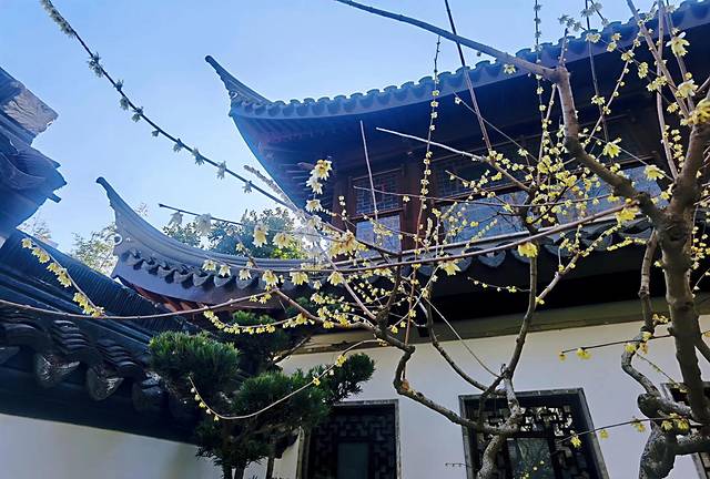 “古藤园”里的腊梅,最佳取景处应该是“紫云阁”的后院,这里可以拍摄到“墙角数枝梅,凌寒独自开”的画面。当推开“紫云阁”的后门,看到黑色的瓦砖、白色的院墙、褚色的格窗,还有金黄色的腊梅,脑海里突然涌现出大观园的影子,这个场景再也合适不过这样一个人物,那就是披着大红氅,看似娇弱柔嫩,实则刚韧坚强,俏皮又不做作的林妹妹,如果配上婉转缠绵的琴声和大雪纷飞的背景,那绝对是一幅绝妙精致的画面。