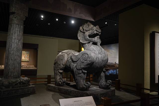 南朝陵墓石刻,这是一尊石麒麟,造型雄伟,昂首挺立,繁缛而华丽,虽然仍存汉代遗风,但韵律已有变化,已经没有汉代大型石刻的朴拙,显得威武而富有灵气。麒麟也是帝王陵墓才可以设的石刻。