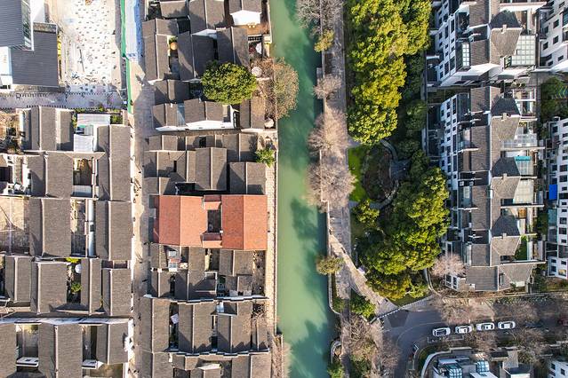 从空中看古运河就像一条绿色的玉带横亘在城市中央,两旁是白墙黛瓦的房子。不远处是城市的高楼大厦,古今结合,很有意思。